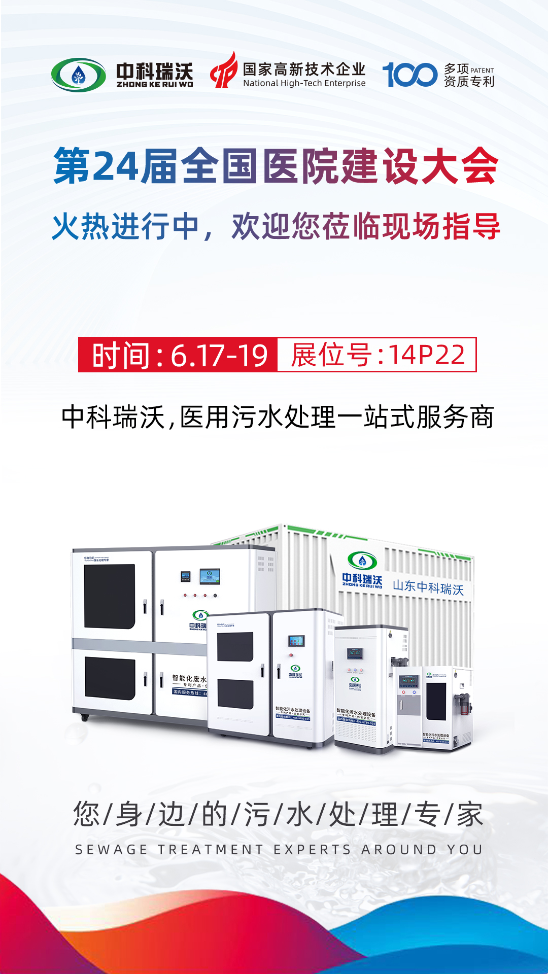 此次展會(huì)為期三天,6月17-6月19號(hào)您都可以蒞臨全國醫(yī)院建設(shè)大會(huì)中科瑞沃展位,我們將為您提供專業(yè)系統(tǒng)化的醫(yī)用污水解決方案!